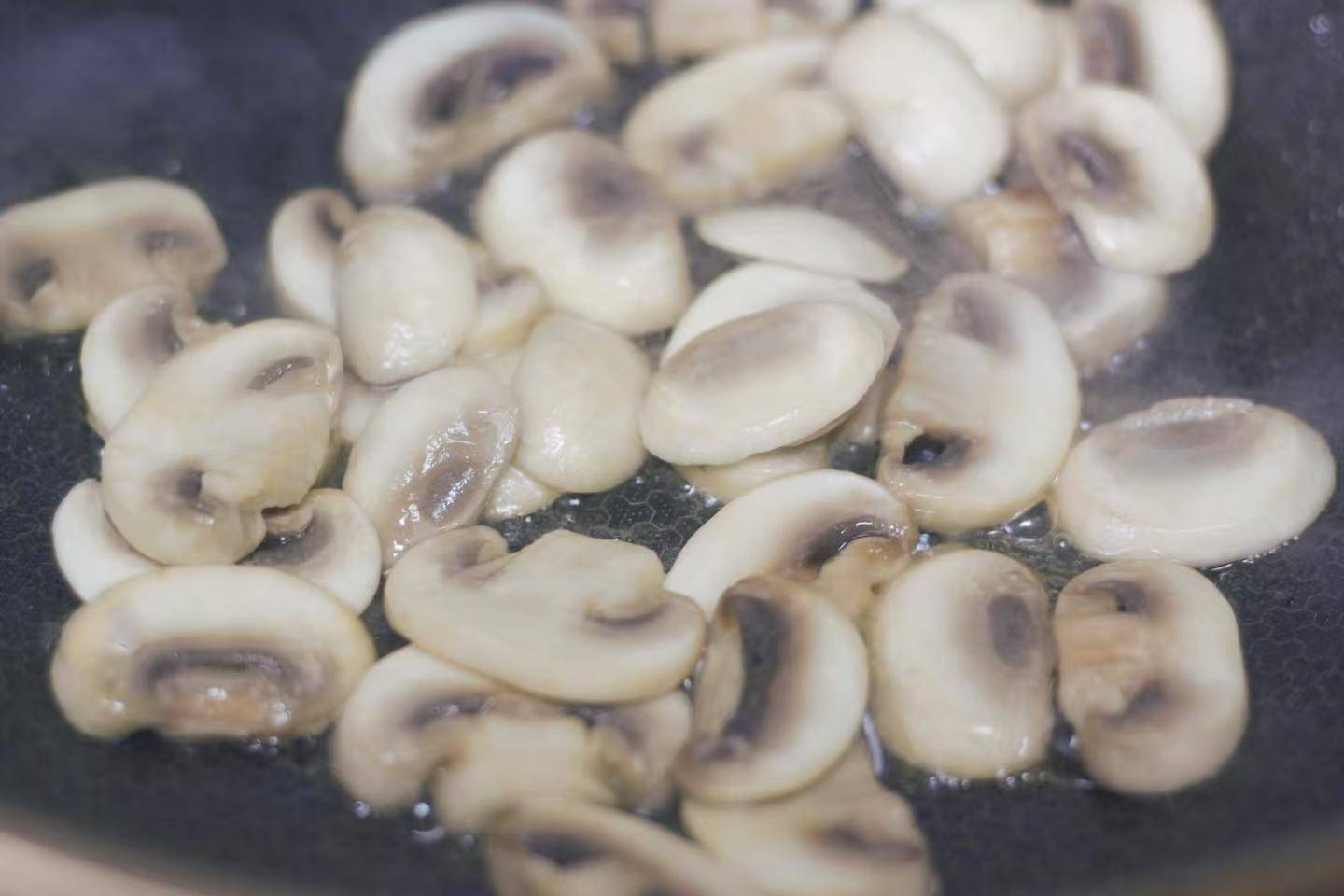 3、锅里的油先烧热,把口蘑倒在里边,反复炒一会儿,将其炒透炒熟。