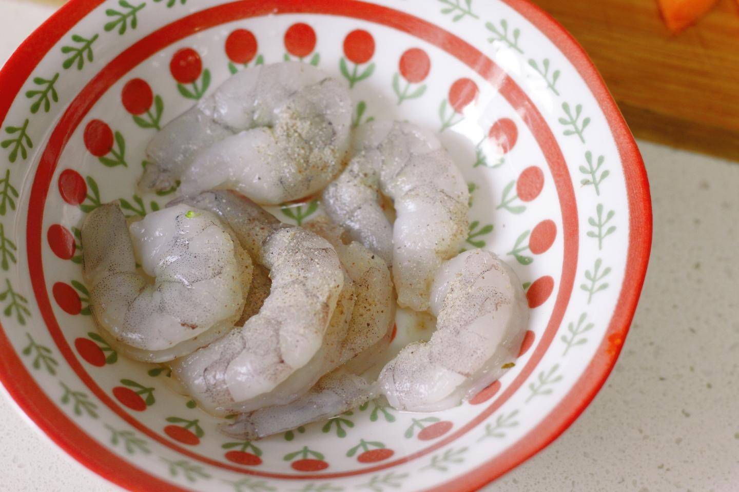 2、另外准备几只大虾,一一剥出来,并且清理掉杂质,然后加点胡椒,姜汁拌匀。