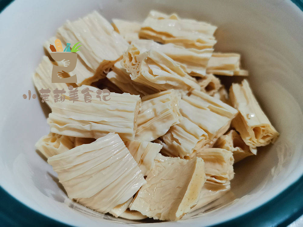 2、提前取出一些干腐竹,用清水加以浸泡,令其吸水,彻底软透后,切成小段。