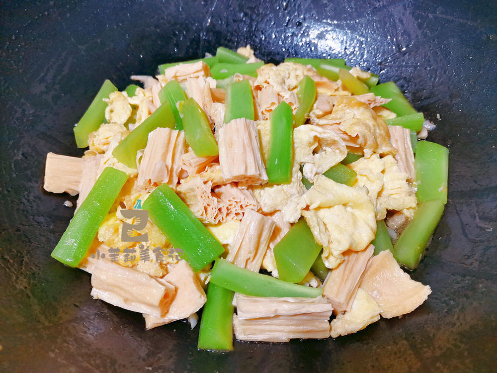 4、接着在其中加葱花蒜蓉,莴笋和腐竹一起倒里边,调入酱油,蚝油,反复炒一会儿,大约一分钟就熟了。届时把鸡蛋再次倒进里边,撒些盐,继续炒入味,马上关火盛出来即可。