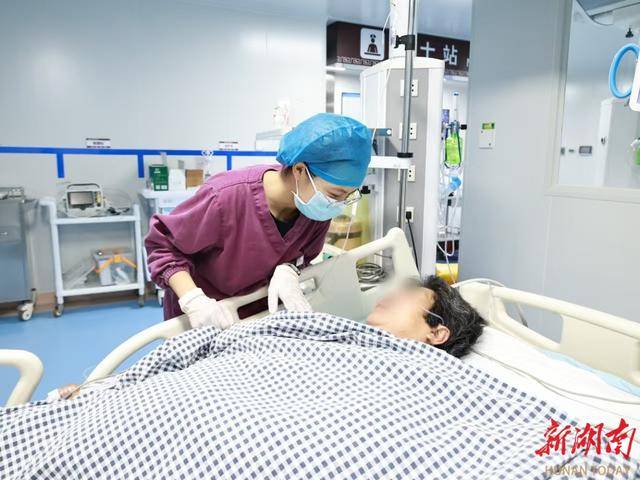 图为永州市新田县中医医院ICU护士与患者温柔沟通