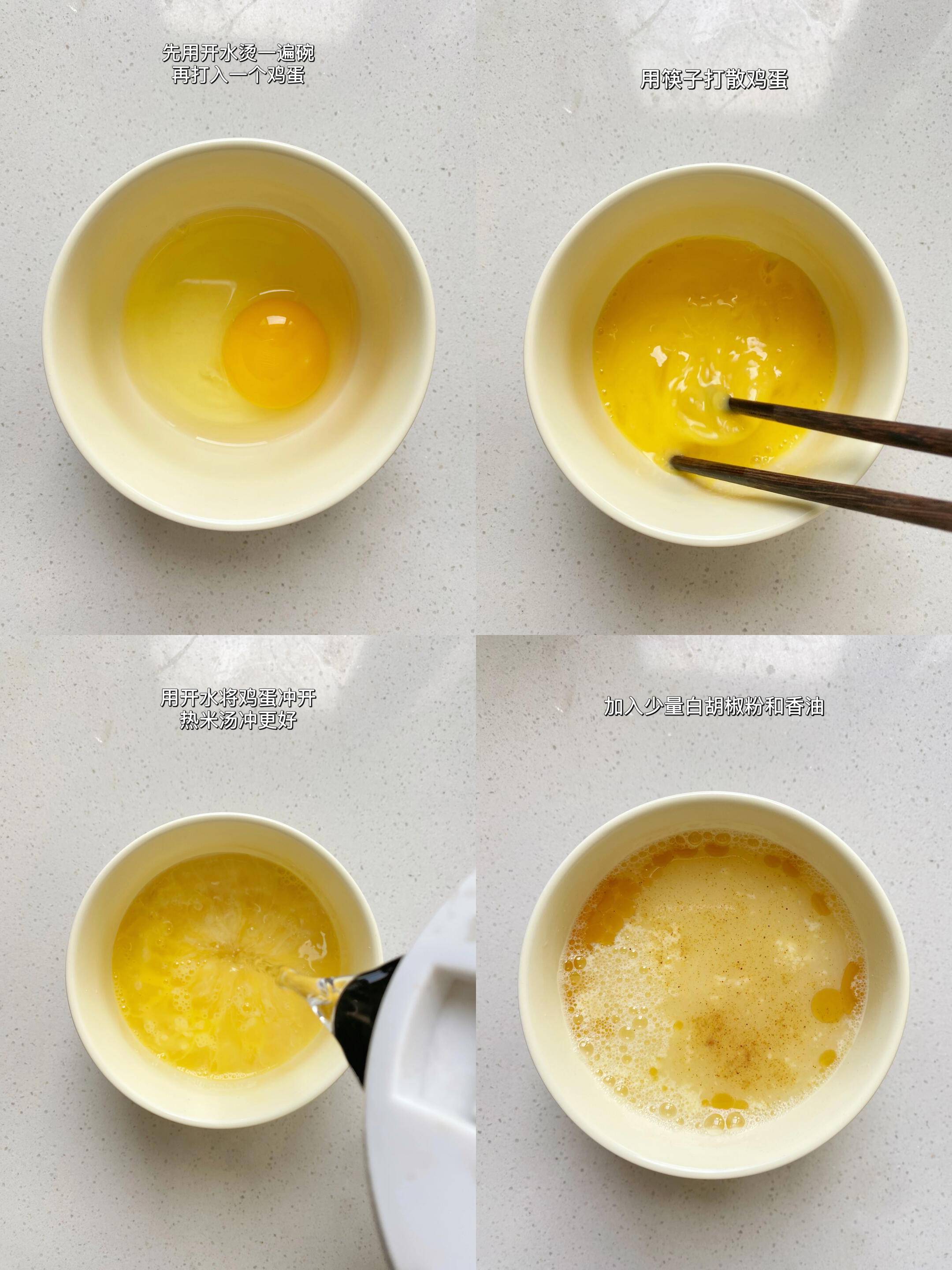 2、然后,将鸡蛋打散,用煮好的热水/米汤冲入鸡蛋中,用筷子迅速搅拌,使鸡蛋形成细细的蛋花,最后,可以根据个人口味加入适量的香油和白胡椒粉,也可以加入一些红枣、枸杞等食材。