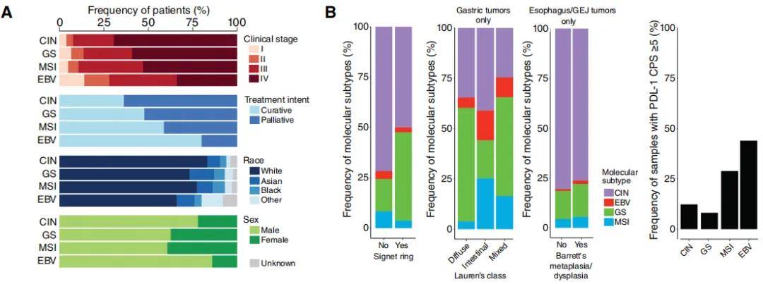 按分子亚型分层的患者特征总结于表1。性别和种族等人口学特征反映了美国食管胃腺癌的人群分布,且在分子亚型间存在显著差异(图2A)。总体而言,EBV或MSI型肿瘤患者确诊时分期较早,因此更可能接受包括手术在内的根治性治疗,而CIN或GS型肿瘤患者确诊时更可能已处于晚期并接受姑息治疗(图2A)。活检或手术标本中Barrett化生或异型增生的存在与特定亚型无关,而Lauren弥漫型或混合型分类及低分化印戒细胞组织学与GS亚型相关(图2B)。与CIN和GS型肿瘤相比,EBV和MSI型肿瘤中PD-L1综合阳性评分≥5的比例显著更高,而GS型肿瘤大多为PD-L1阴性(图2B)。