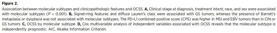 Kaplan-Meier分析显示,分子亚型与本研究队列中的癌症特异性总生存期(OCSS)相关(图2C)。EBV或MSI型肿瘤患者的OCSS显著优于CIN或GS型肿瘤患者,后两者的OCSS均较差且相似。当按治疗意图(根治性或姑息性)对亚型进行分层时,这种关联在根治性治疗队列和姑息性治疗队列中均显著。研究者随后探讨了免疫治疗是否是EBV或MSI型肿瘤患者OCSS更好的潜在因素。研究者观察到,尽管在姑息性治疗队列中,免疫治疗可能有助于MSI型肿瘤患者获得更好的预后,但由于姑息性治疗队列中未接受任何免疫治疗的患者相对较少,且根治性治疗队列中接受免疫治疗的患者也较少,因此比较受到限制。接下来,研究者进行了Cox单变量分析,以确定队列中所有预后相关的临床病理变量。正如预期,临床分期、种族、肿瘤分级、根治性手术、治疗意图和分子亚型均与OCSS相关。随后的Cox多变量分析显示,在纳入临床分期和肿瘤分级等与OCSS相关的独立变量后,分子亚型仍具有预后价值(图2D)。