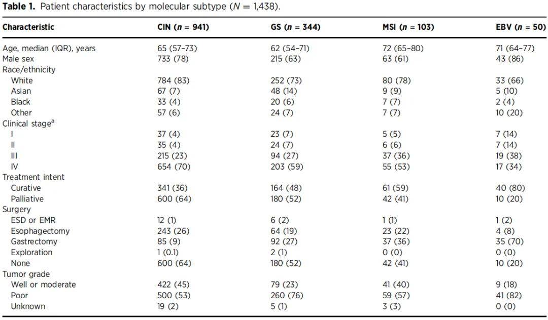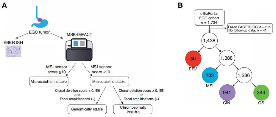 癌症基因组图谱(TCGA)项目将食管胃腺癌定义为四种不同的分子亚型:微卫星不稳定型(MSI)、EB病毒(EBV)相关型、基因组稳定型(GS)和染色体不稳定型(CIN)。然而,分子亚型与临床结局之间的关联尚未明确证实。鉴于可用于指导治疗的生物标志物有限,研究者探讨了TCGA分子分型系统的临床相关性。研究者纳入了2014年至2023年期间接受纪念斯隆凯特琳癌症中心IMPACT检测(前瞻性下一代测序)的所有食管胃腺癌患者。根据TCGA的方法对所有肿瘤进行分子分型,并将分子亚型与高质量的临床病理数据进行关联分析。