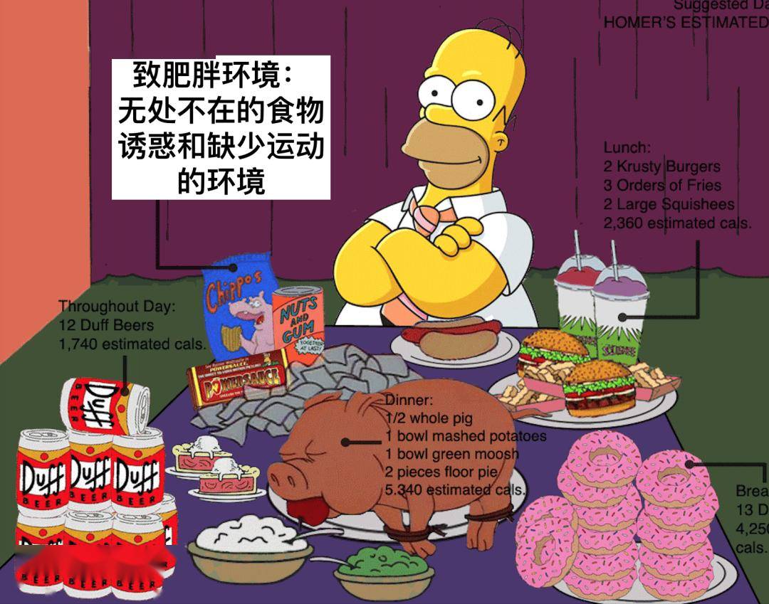 如果一个个体生活在一个“致肥胖”的环境中,简单易得的食物大多是不健康的高热量高糖高油食物,而周围的人群对于这样的膳食习以为常,随处可见的广告也在刺激人们购买不健康食物。同时这个人生活的节奏完全没有时间让他自己准备食物,而他生活的社区居住密度非常高,没有合适的公园或者锻炼场所,他很难进行有效的锻炼,在这样的环境中,肥胖不是这个个体的“不够自律”导致的,而是整个社会环境的必然结果。而这样的描述是不是让很多人似曾相识?因为这正是我们身边很多人的生活状态。