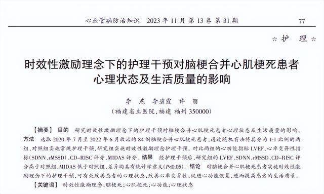 [1] 李燕.时效性激励理念下的护理干预对脑梗合并心肌梗死患者心理状态及生活质量的影响, 心血管病防治知识 ,2023-11-05