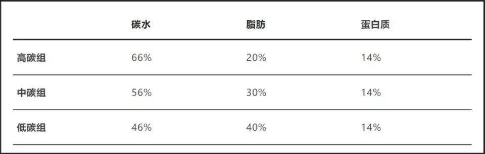 受试者被分成3组,按照碳水的摄入量分为高碳、中碳、低碳组,蛋白质摄入相同,总热量摄入相同。