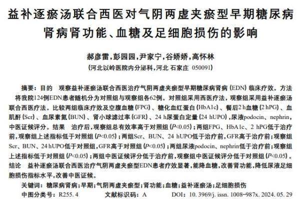 [1]郝彦雷.益补逐瘀汤联合西医对气阴两虚夹瘀型早期糖尿病肾病肾功能、血糖及足细胞损伤的影响,湖北中医药大学学报,2024-10-20