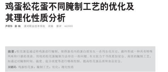 [1]芦荣华,鸡蛋松花蛋不同腌制工艺的优化及其理化性质分析,2024-09-23