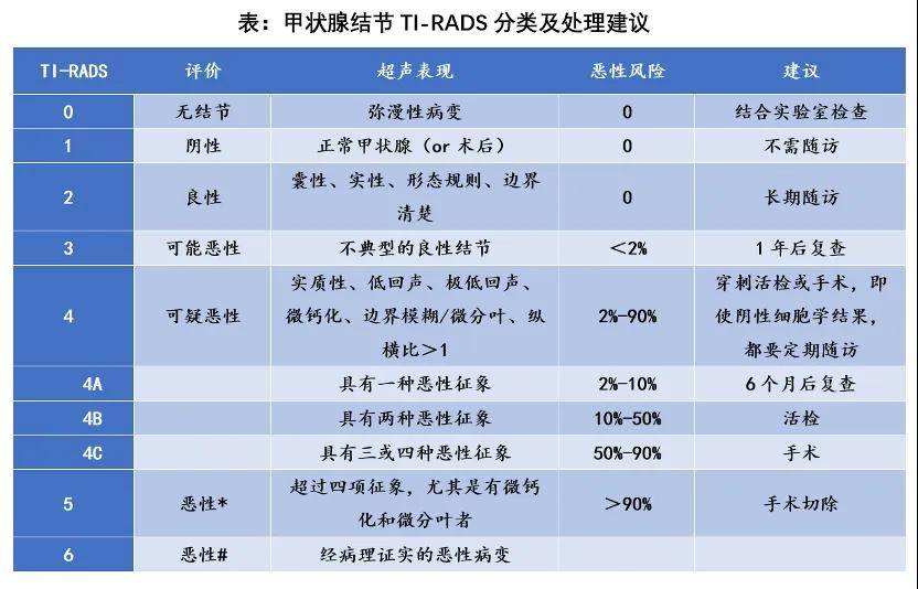 超声检查TI-RADS 3类及以下的结节提示恶性征象<2%,4a类以上的结节恶性程度明显增高,应及时门诊就诊,必要时穿刺活检或手术治疗。
