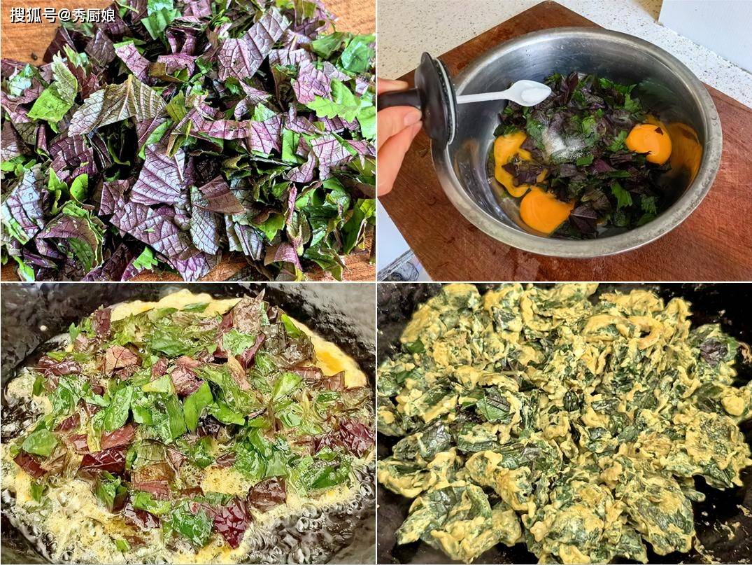 4. 鸡蛋炒至七八成熟,大部分凝固但还带点湿润时,倒入切好的紫苏碎。