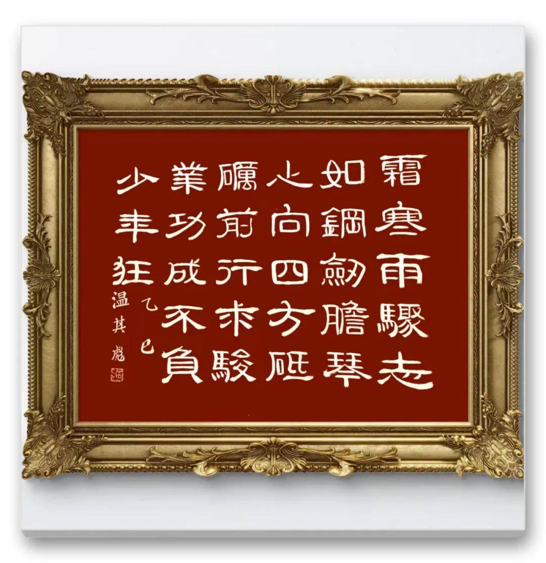 创作中,温其彪先生不拘泥于古法,将深厚的艺术积淀与独特的理论见解注入笔墨。笔法运用上,他追求刚柔并济的境界,让线条既有金石碰撞的铿锵之刚,又含丝绸拂面的温润之柔,打破传统隶书刻板的桎梏,为作品注入灵动鲜活的生命力。在视觉呈现上,他巧妙架起古今桥梁,让笔墨既有穿越千年的古韵,又契合现代审美需求,令人眼前一亮。