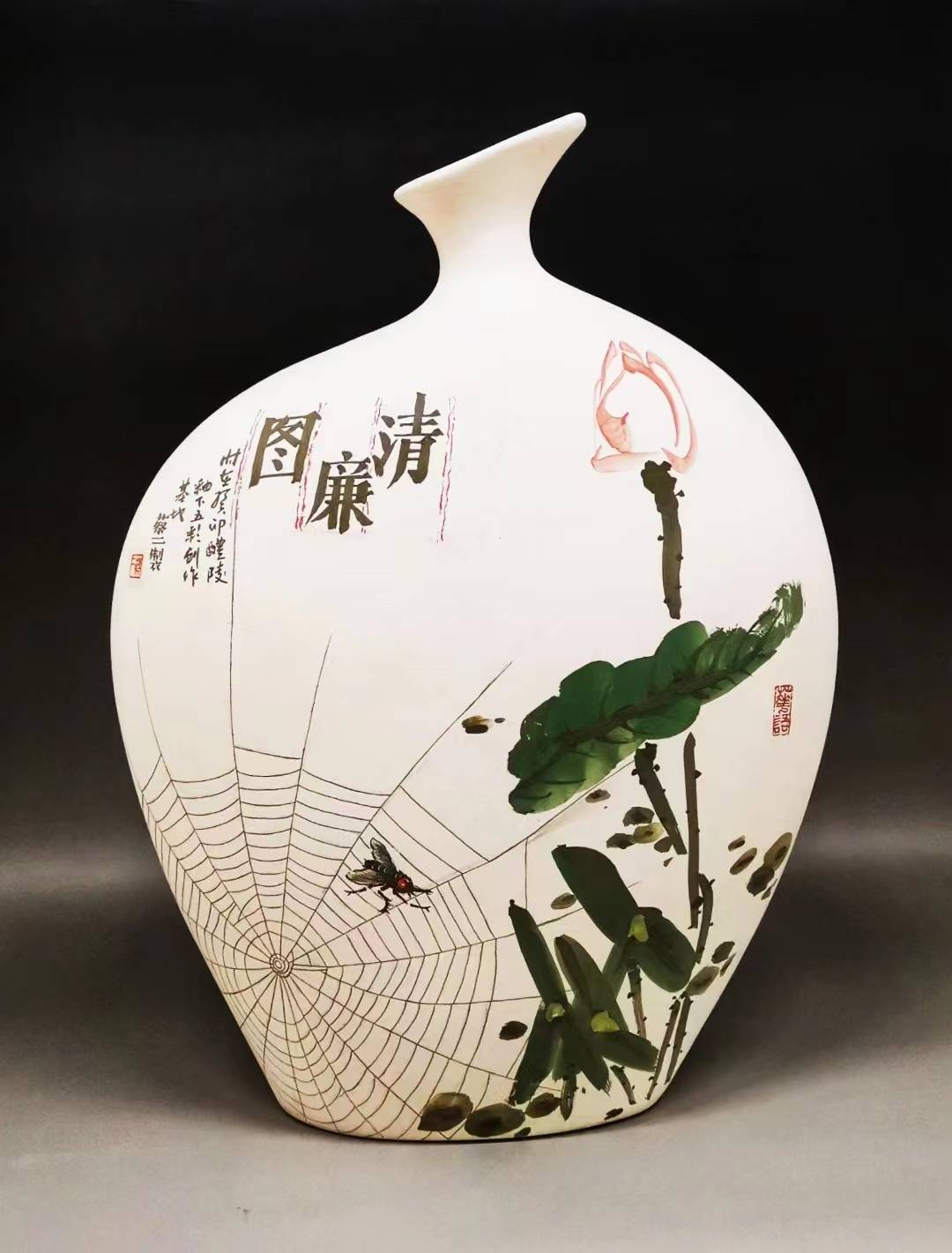 《清廉图》以白色的陶瓷瓶为载体,描绘了荷花在污泥中生长却始终保持清洁高雅的形象。在中国传统文化中,荷花象征着高尚的道德品质和清正廉洁的精神风貌,以陶瓷为载体做书画,旨在诠释清正廉洁的法治底色,提倡忠诚、干净、担当的美好品质。