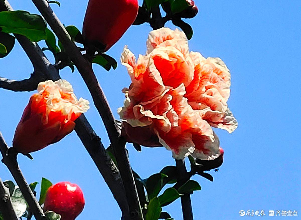5月5日,在小区里拍到了美丽的玛瑙石榴花。看,这少见的石榴花宛如一颗颗玛瑙缀满枝头,花瓣像丝绸一般,细腻又柔软,颜色鲜艳而耀眼,橘红色与边缘的白色相互映衬,放射状的条纹搭配得恰到好处,堪称石榴花里的精品。 高军 摄