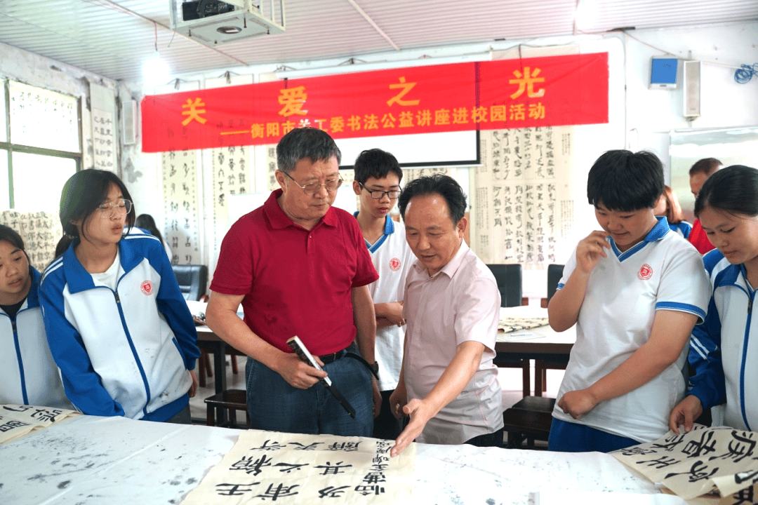 5月9日,由衡阳市关工委主办的“关爱之光·衡阳市关工委书法公益讲座进校园活动”在衡南三中举行。衡阳市关工委任、衡阳市人大常委会原常务副主任、党组原书记谢宏治,衡南县关工委主任胡英泽,衡阳市文化馆原副馆长、衡阳市书画院原专职书法家、二级美术师唐建华,衡阳市关工委秘书长刘峰,衡阳市关工委办公室主任蒋文军,衡阳市关心下一代红色文化传播中心负责人邱毅,衡南县教育局关工委负责人祝小雪,衡南县关工委副主任王五岳等领导专家亲临现场,为校园注入浓浓的翰墨书香。