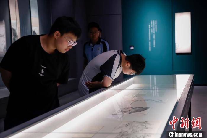 5月14日,浙江杭州,游人打卡黄宾虹《山水册》系列作品。近日,“天地人——纪念黄宾虹诞辰一百六十周年艺术展”在浙江省博物馆展出,包含黄宾虹的经典作品、珍贵画稿、手稿及其收藏古物等160余件(组)引游人观赏。中新社记者 肖健 摄