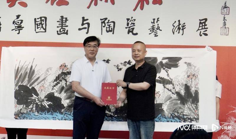 开幕式上,孙海宁先生将精心创作的国画和陶瓷作品,作为礼物赠送给主办方中山美术馆和中山书画院,主办方准备了收藏证书作为回礼。
