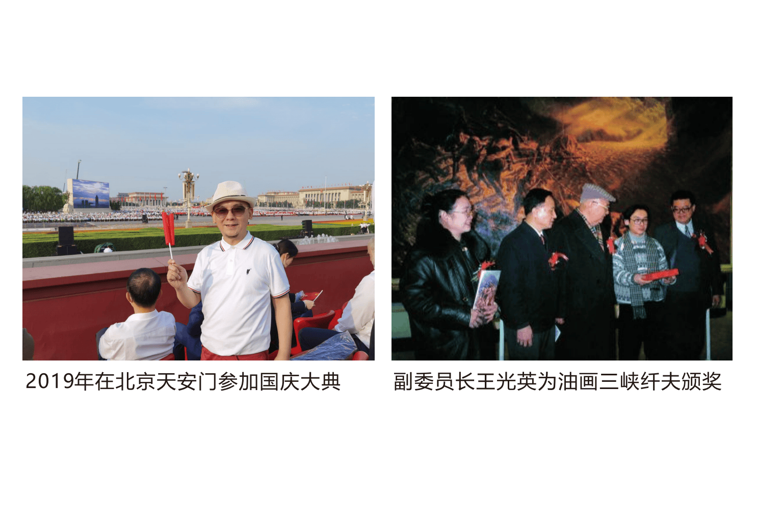 1987年《冬日晨曦》获中国美协第一届中国油画展中国油画 奖,1997年《三峡晨曲》为北京人民大会堂收藏陈列的第一幅油 画,2000年《长江魂-三峡纤夫》获国家文化部群星奖金奖(名列第一),1993年中央电视台东方时空人物专访,2007年在中国美 术馆举办个展,2011获加拿大“大雅文化国际终身艺术成就 奖”,2018获联合国等授予“和平文化大使”称号,2019获法国 国际邮品中心“中欧艺术交流大使荣誉奖杯,2020年获北京心光 生命艺术最高奖。