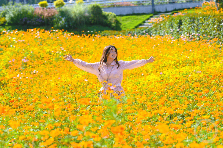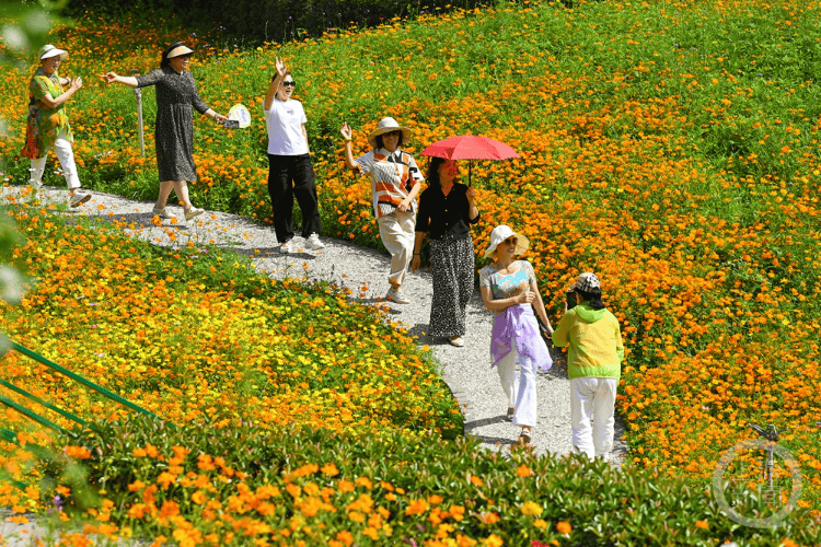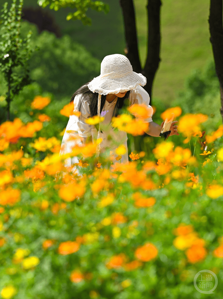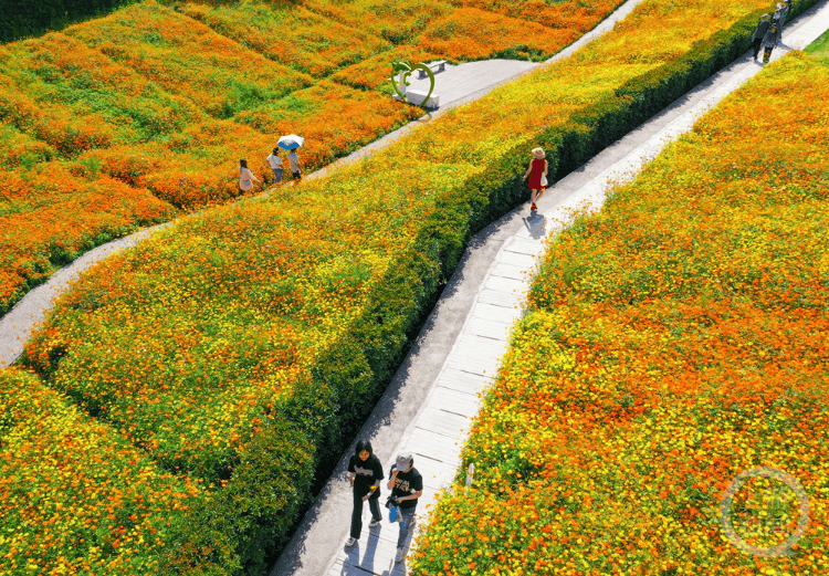 溉澜溪体育公园内,超2.1万平方米的硫华菊迎夏盛放,如金色绸缎铺满山谷。