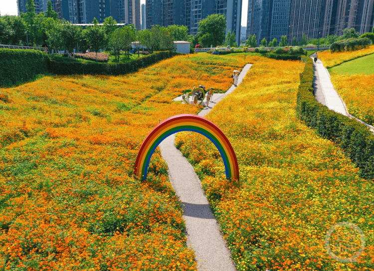 金灿灿的花朵与蓝天、彩虹拱门及远处现代楼宇交相辉映,绘就一幅生机勃勃的都市画卷。