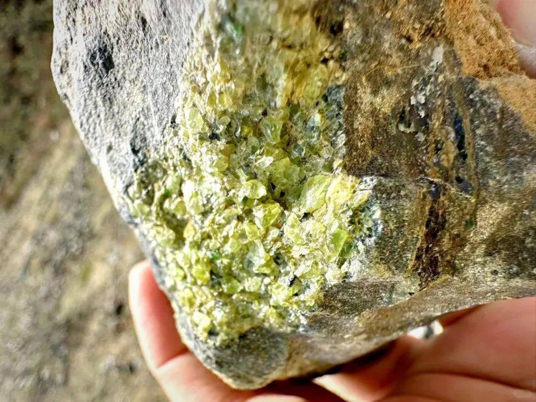 橄榄石外的岩石被风化后,留下晶莹的橄榄石细碎铺了一地,随便选一处蹲下开捡,不蹲到腿麻都不用起身。