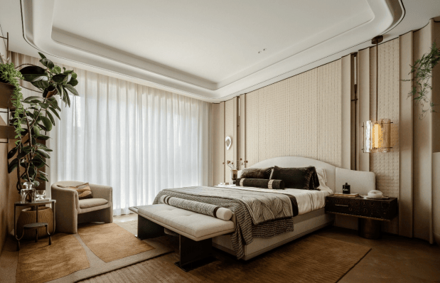 细节改进渗透于每一寸场域,编织皮革背景墙以纹理的层次感为空间注入温度;氛围灯光系统通过隐藏式灯带、可调节光源,在不同场景下勾勒出光影的情绪变化;隐藏型收纳则化身为柜体与墙体的“隐形脉络”,从玄关到卧室,让日常物品各得其所,却不破坏空间的艺术完整性。